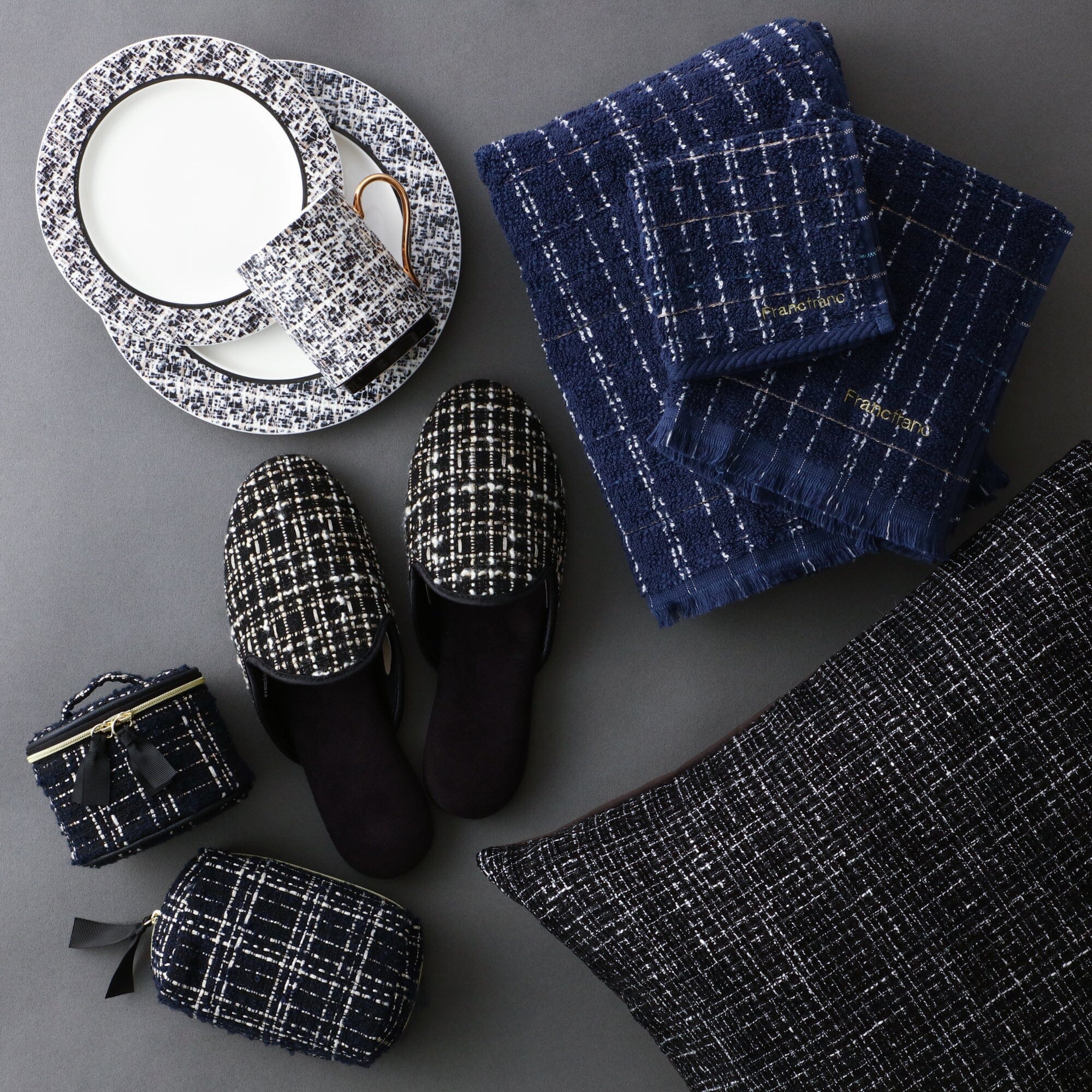 These Indoor Shoes have a tweed design with cuts that look like flowers.